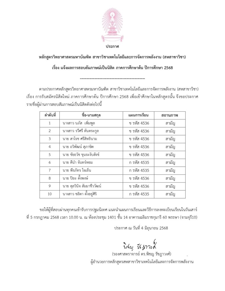 ประกาศ แจ้งผลสอบสัมภาษณ์นิสิต ภาคการศึกษาต้น ปีการศึกษา 2568 (เพิ่มเติม)